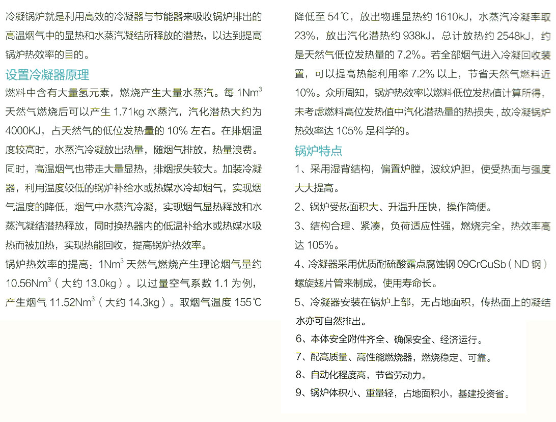產品簡介:冷凝鍋爐就是利用高效的泠凝器與節能器來吸收鍋爐排除的高溫煙氣中的顯熱和水蒸汽凝結索釋放的潛熱,以達到提高鍋爐熱效率的目的。